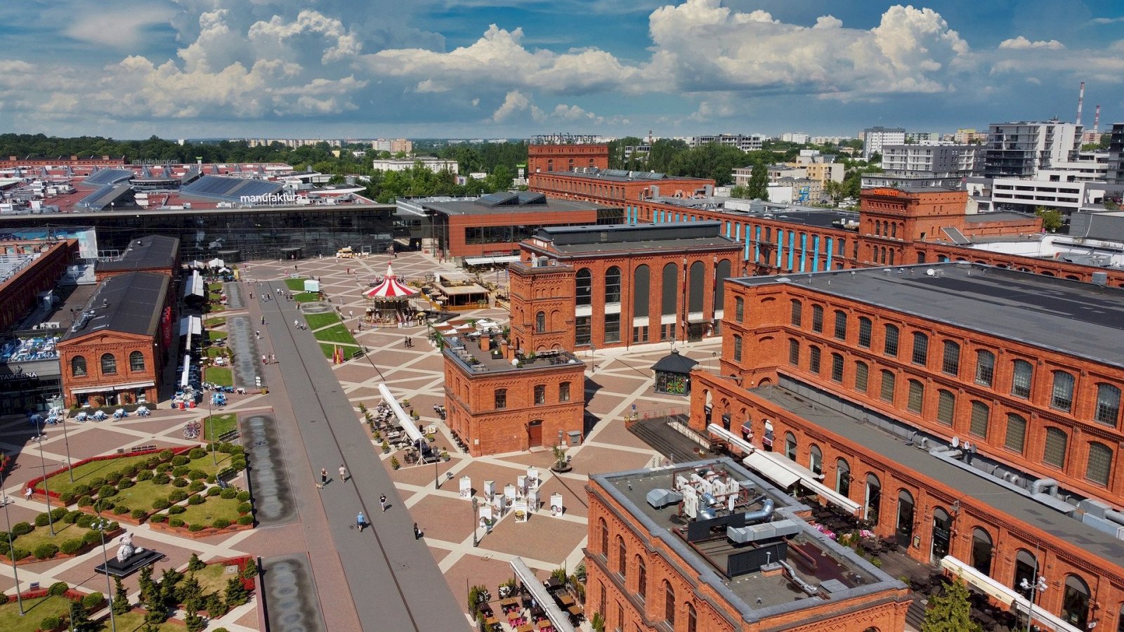 - dojście do Manufaktury – dawnego kompleksu fabrycznego, który dziś tętni życiem jako centrum kultury, rozrywki i handlu,